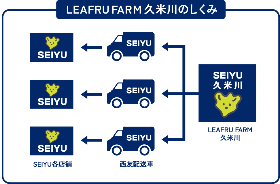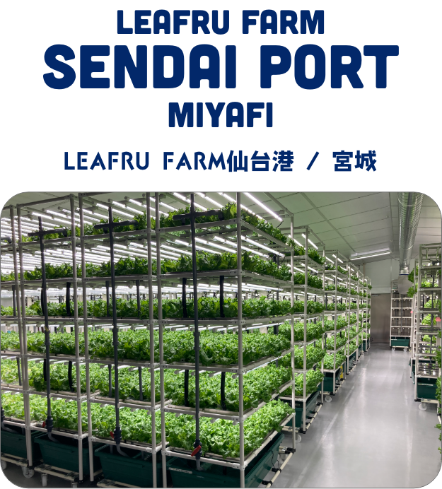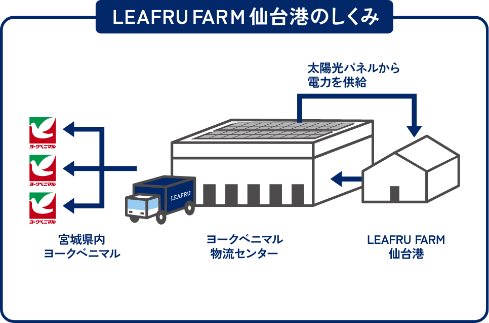 LEAFRU FARM仙台港はヨークベニマル物流センターの敷地内にあります。こちらの工場では太陽光発電から電力共有しています。また物流センターが隣なので収穫から出荷まで最短の距離で宮城県内のヨークベニマルに配送しています。