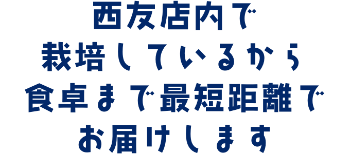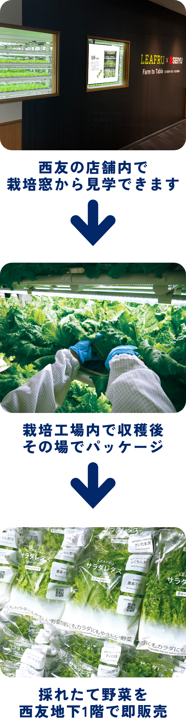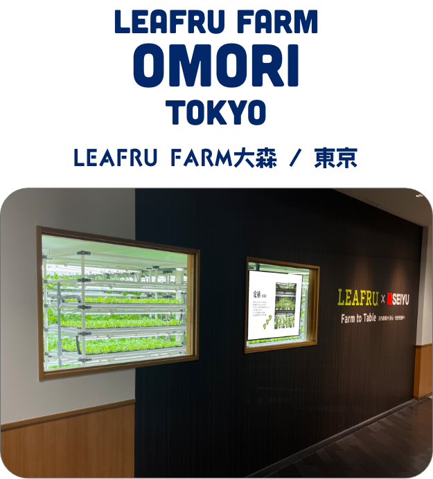 LEAFRU FARM 大森は西友店内の5階にあります栽培工場内で育ったレタスを栽培し、すぐにその場でパッケージします。とれたてのレタスは西友の地下ですぐに販売されます。これぞ本当のとれたて新鮮な野菜です。