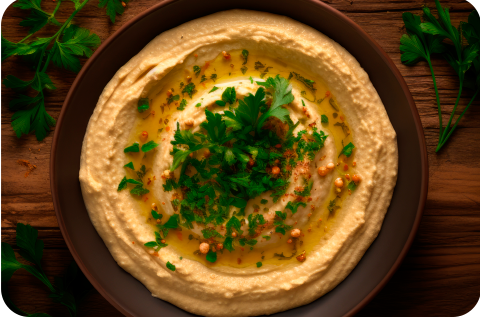 フムスは、中東の料理で、ひよこ豆やタヒニ、レモン汁などをペースト状にしたものです。爽やかな香りとほろ苦い風味が特徴のイタリアンパセリは、フムスに欠かせないハーブです。フムスの彩りを添え、見た目にもおいしいハーブです。