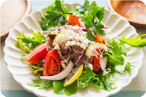 イタリアンパセリの鮮やかな緑色は、サラダに彩りと食感をプラスします。また、イタリアンパセリのほろ苦い風味が、サラダの甘みを際立たせます。特に、トマトやキュウリなどの野菜の甘味や旨味とよく合います。